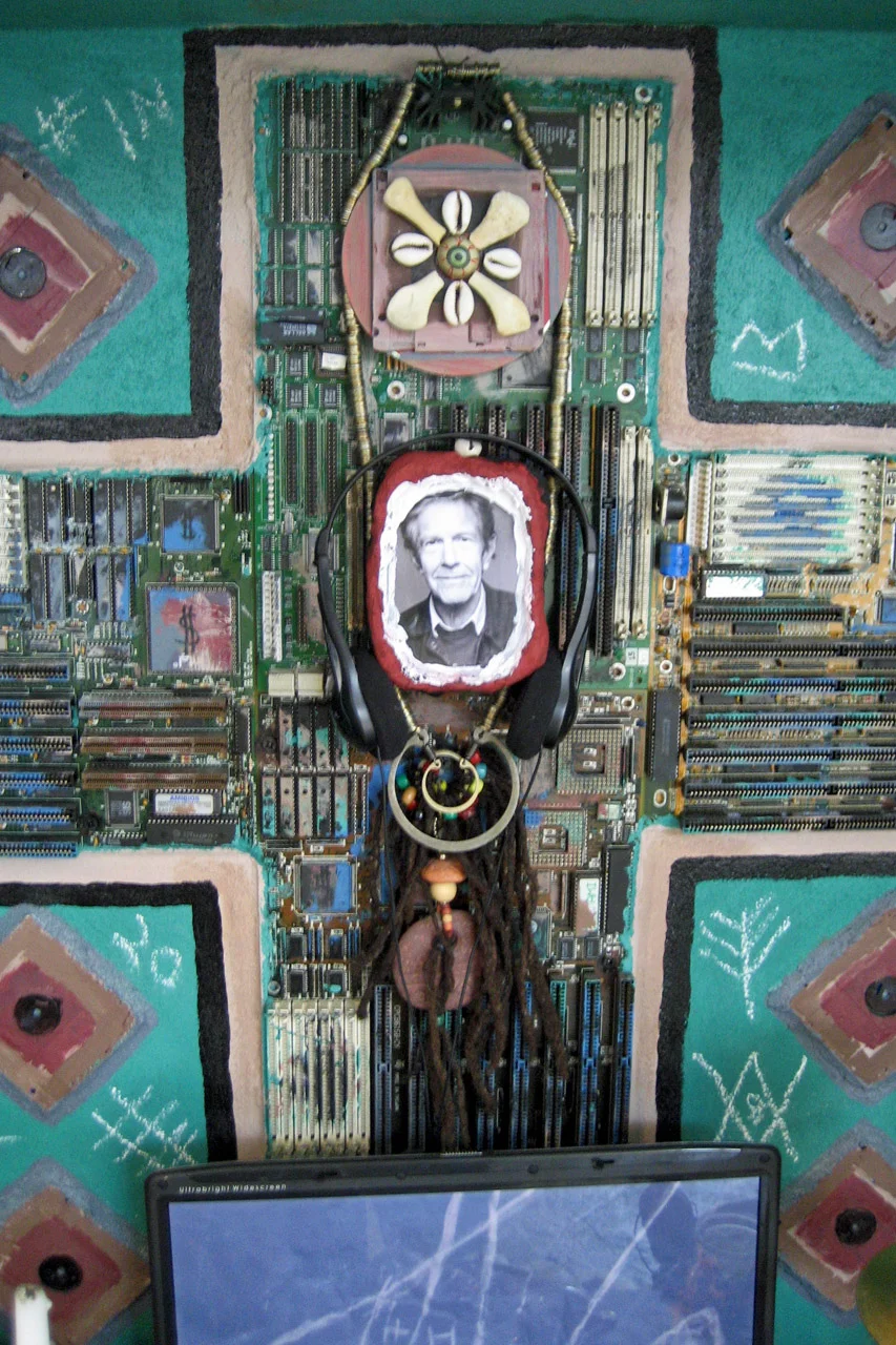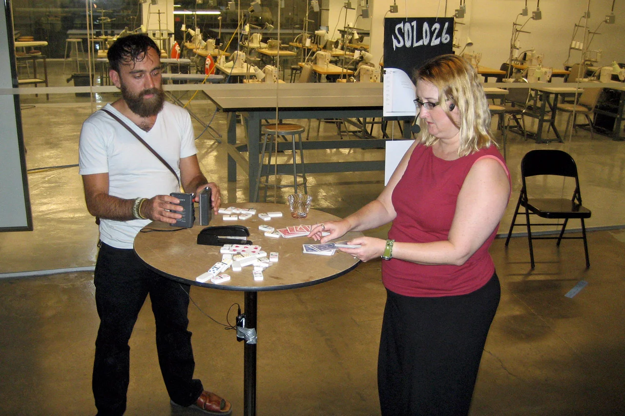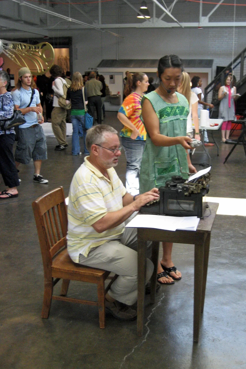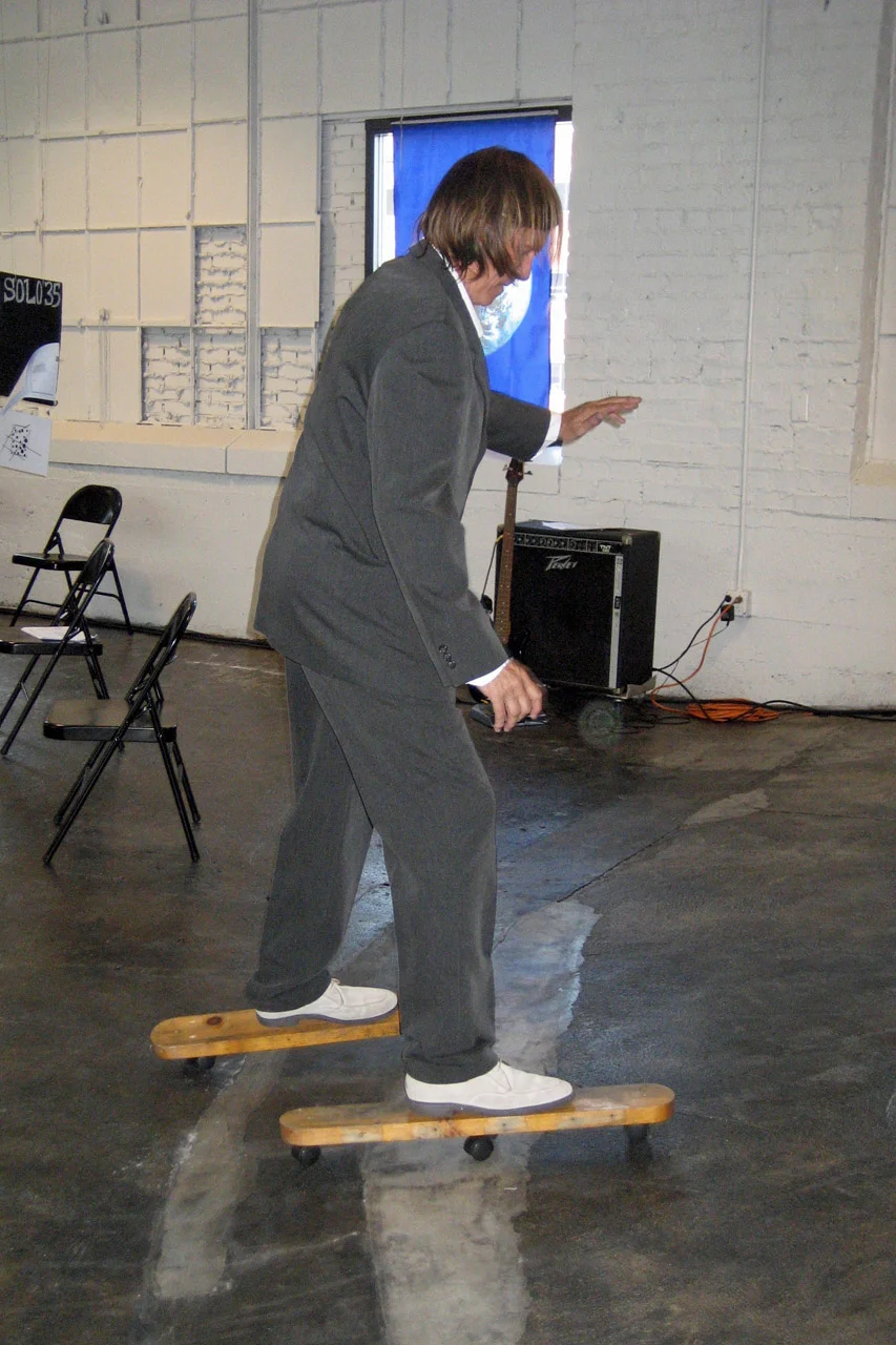 Note the several scores and solo numbers from Song Books posted on chalkboards. In the box were “runes,” symbols from a font based on Cage’s manuscript, that invited audience members to perform certain solos that could easily be realized without preparation. Appearing in these “public participation” solos are Dean of Media Studies Ron Saks, President Dennison Griffith, and several students or other members of the community. Among the more popular solos were those that called for typing a given sentence on an amplified typewriter, playing a game, and interpreting Cage’s Solo 78, the score to which reads “What can you do? I can take off my shoes and put them on.” The large winged sculpture in the center of the performance space is Michelle Lach’s Oracle, which seemed an appropriate addition to this environment where chance played a major role.