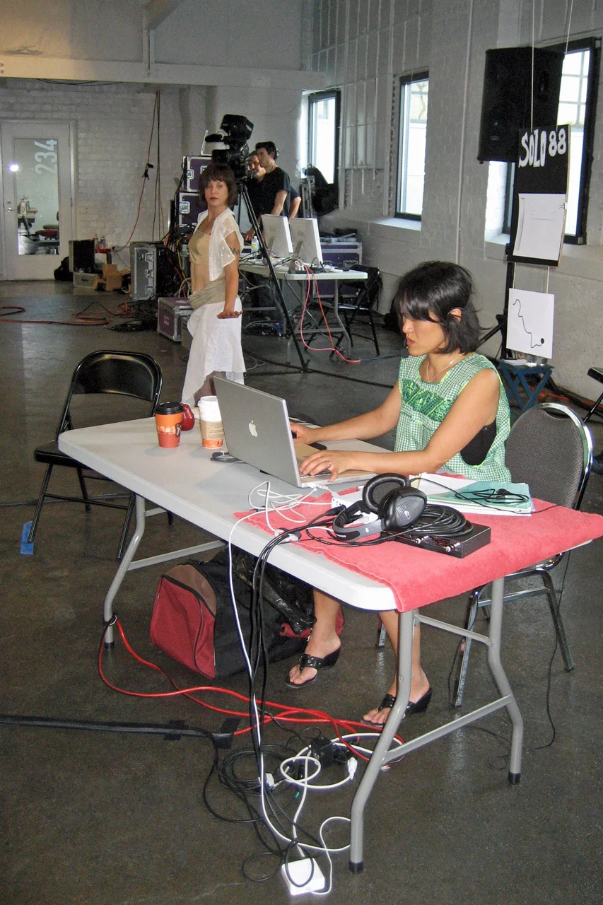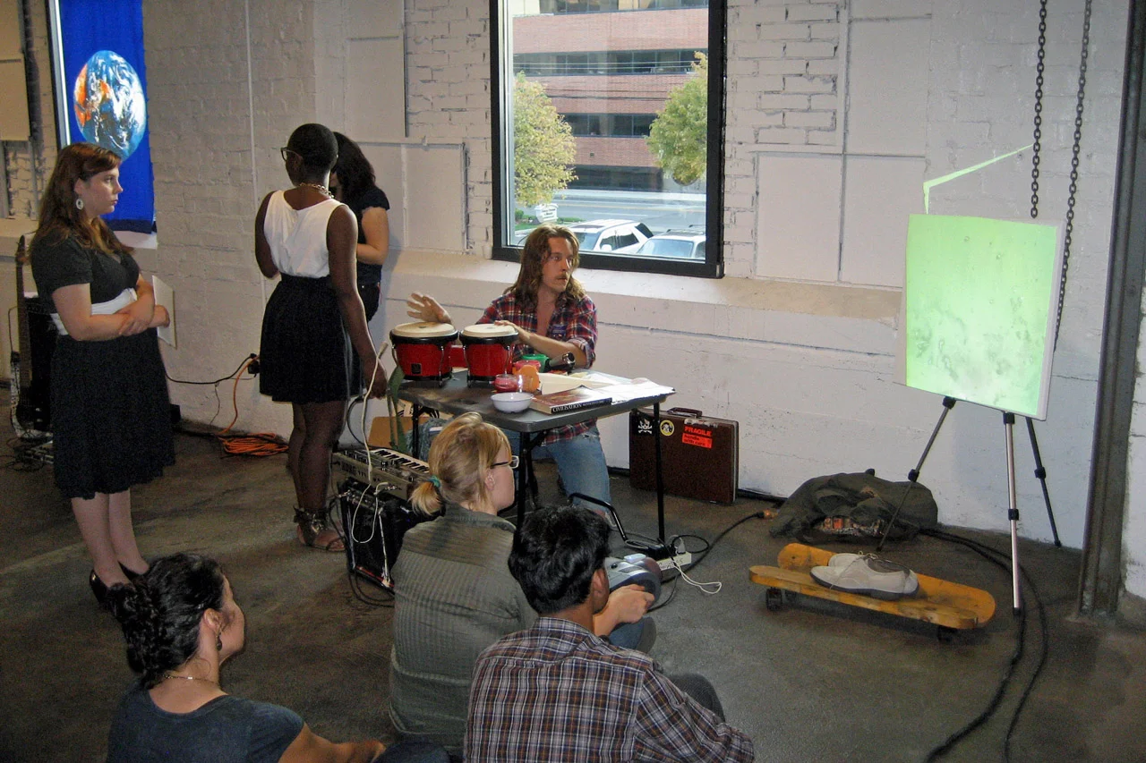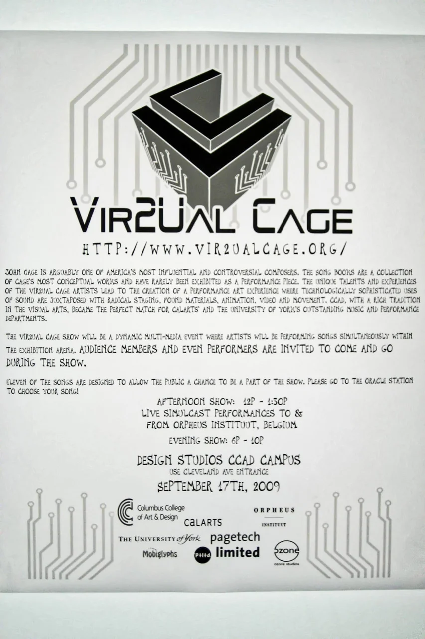 Vir2Ual Cage’s workshops and performances at the Columbus College of Art and Design were inaugural events in the project. Mounting the two performances—Thursday, 17 September 2009, at 12:00–1:30 p.m. and 6:00–10:00 p.m.—involved extraordinary collaboration and logistical support, what with numerous performers, a complex sound system, and live video streaming between Columbus, Ohio and Ghent, Belgium, where a simultaneous performance of Song Books took place at the Orpheus Institute.