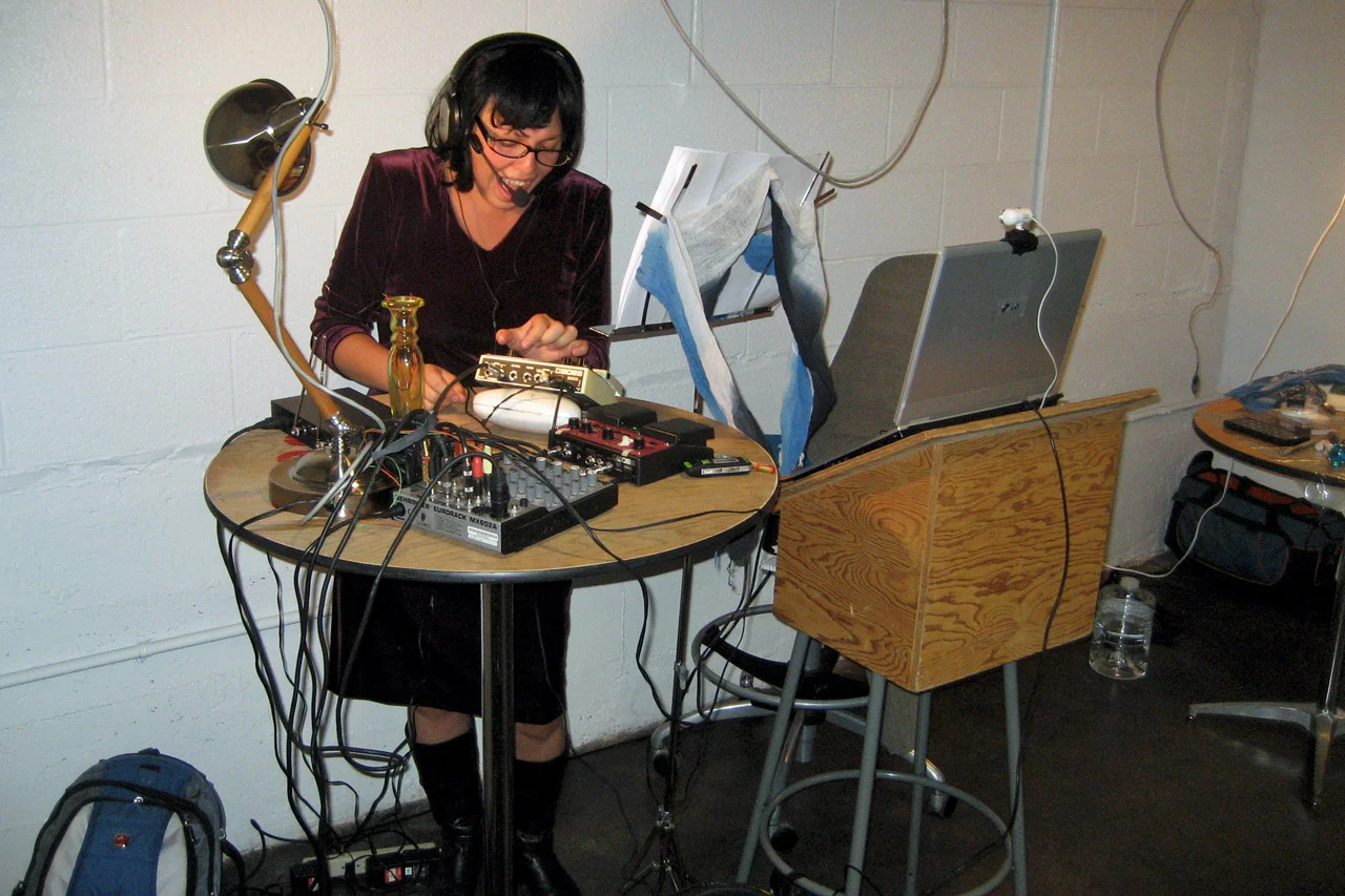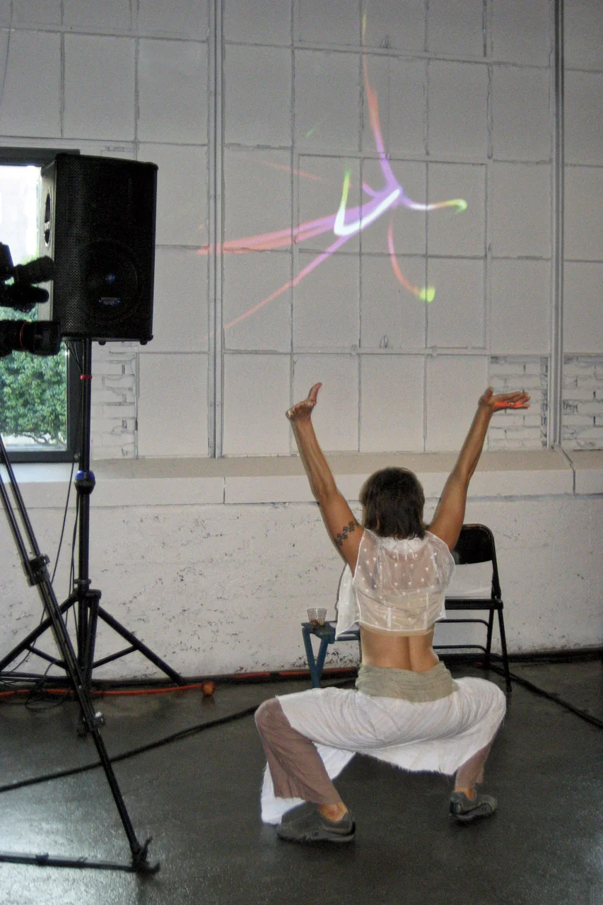 Seen in the following photos are singers Jacqueline Bobak, Paul Berkolds, Nina Eidsheim, and Carmina Escobar; instrumentalists Rocco Di Pietro and Larry Marotta; dancer Kathy Carbone; and performance artists Danielle Julian-Norton and Tim Rietenbach. Two photos show a unique multi-media work by Ike Newsum, who created an intricate homage to John Cage and Merce Cunningham. Also participating were several students from the Columbus College of Art and Design and Ohio State University; some of them performed live, while others played cameo roles, contributed videos, or made installations.